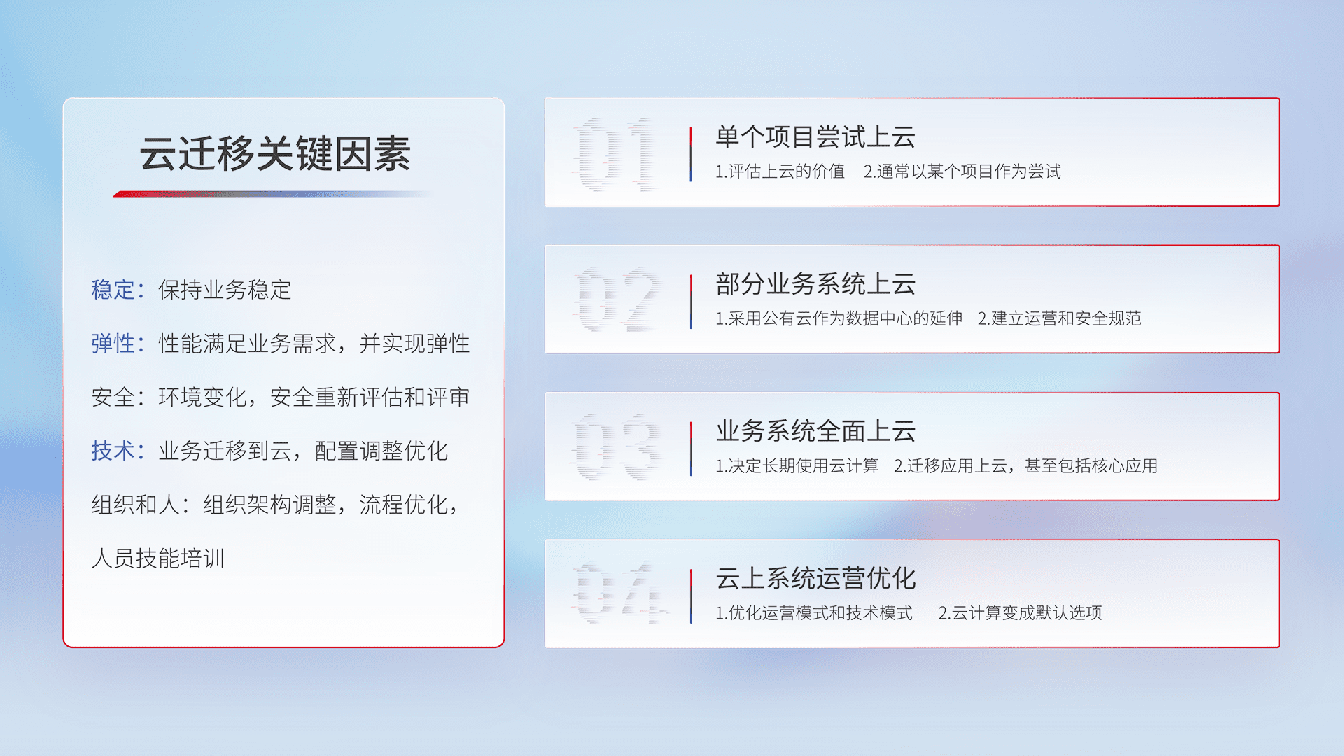 结合实际业务,,,从规划设计、、云平台选型、、、云原生改造、、、数据迁移、、集成交付,,,迁移全过程为客户识别最佳上云路径,,,做好风险识别管理,,,设计网络架构、、身份权限、、安全审计合规、、、操作审计、、、日志审计、、、、监控告警策略、、、多站点容灾设计等,,,对云上基础设施进行整体规划,,,提升IT治理水平,,,,以满足弹性、、高可用、、、、高性能的需求。。。