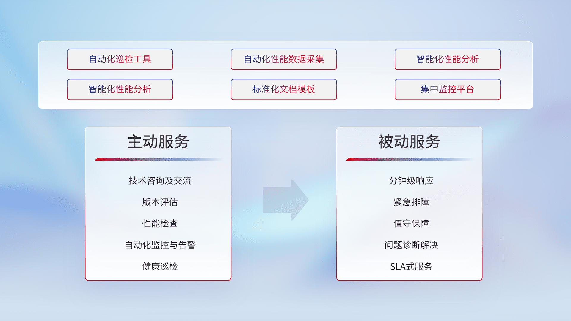 智能化工具和标准化文档,,保障服务质量,,提供主动服务(包含技术咨询、、、、版本评估、、、、性能检查、、自动化监控与告警、、、健康巡检)和被动服务包含(分钟级响应、、紧急排障、、值守保障、、、问题诊断解决、、、、SLA服务)。。。。