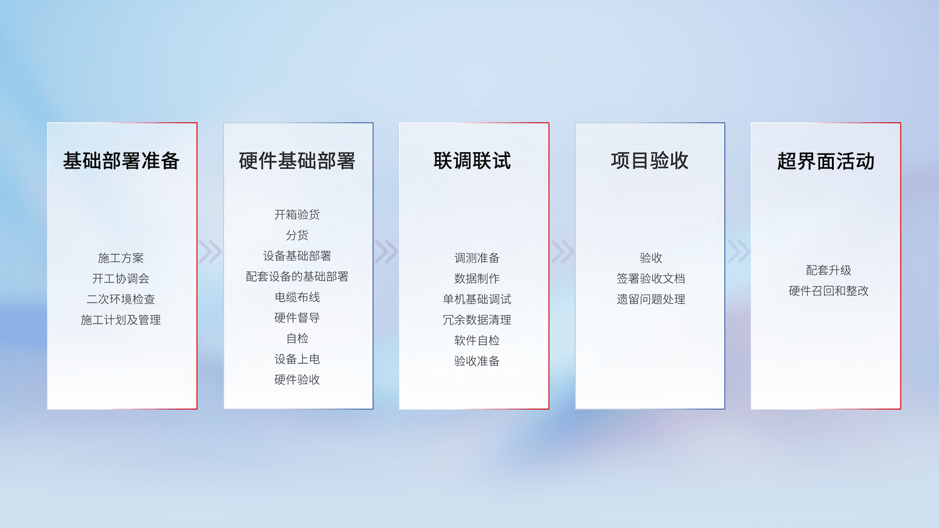 从基础部署准备、、、硬件基础部署、、、联调联试、、、项目验收、、、、越界面活动的全过程可追溯,,保证施工质量和进度。。